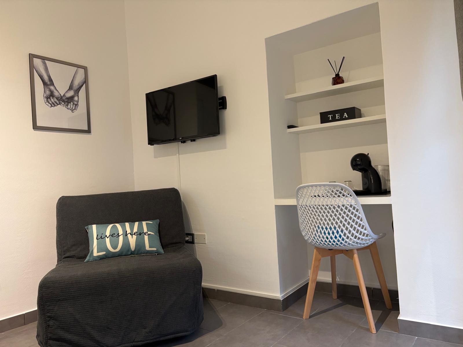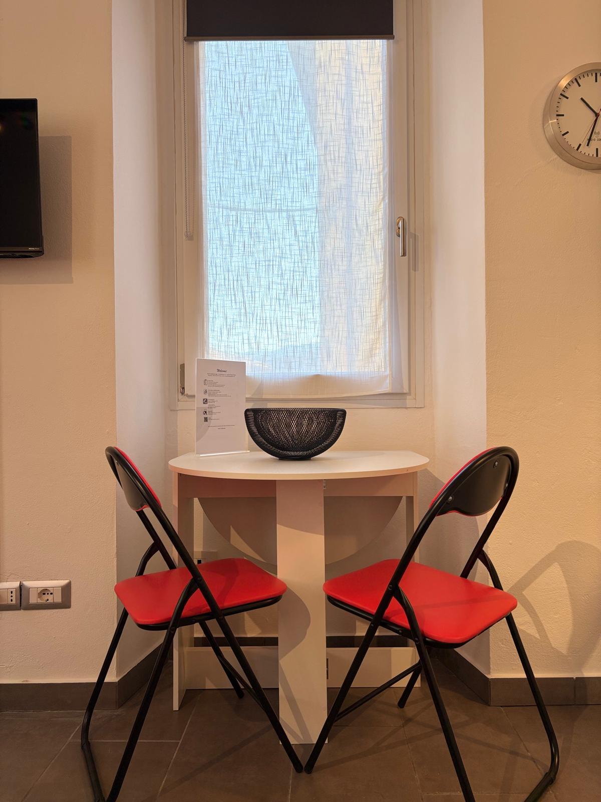 A spacious 40 m² studio with a kitchenette, where touches of red warm the elegance of the white walls. The private terrace is perfect for outdoor lunches or BBQs, sunbathing, or simply unwinding on summer evenings. Four large windows fill the space with light, offering a partial lake view and unforgettable sunsets. Our Suite can accommodate up to two guests (a travel cot is available upon request).